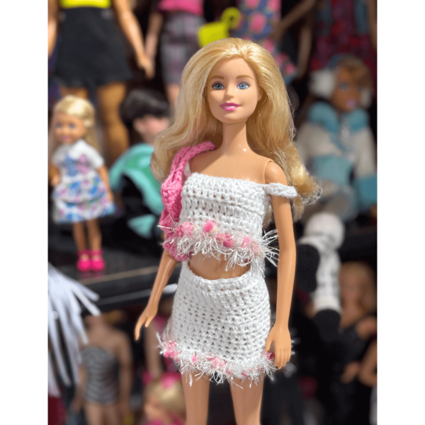 🧵 Top blanco tejido con detalle de pelito y pollerita a juego