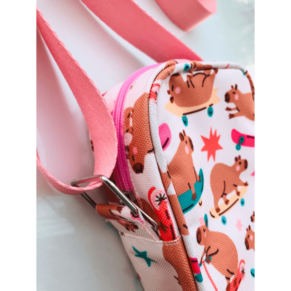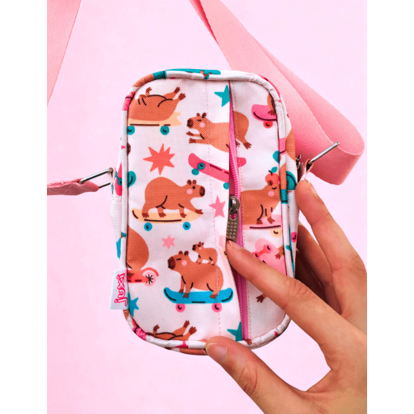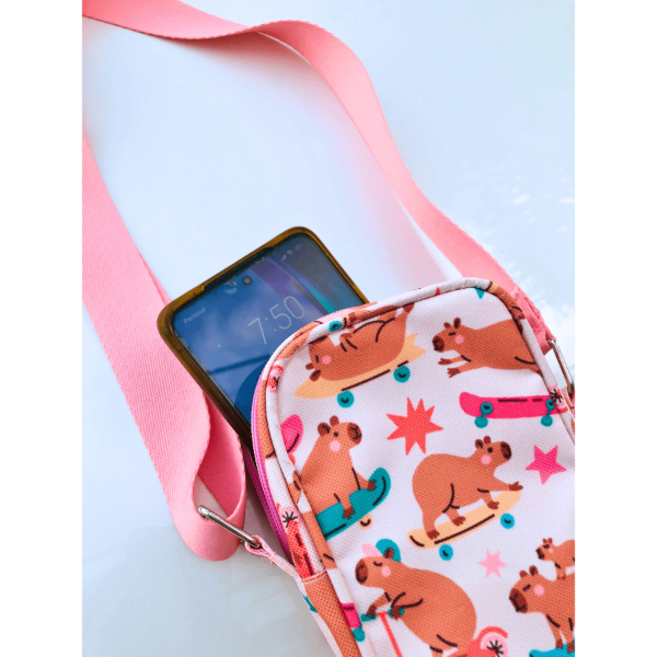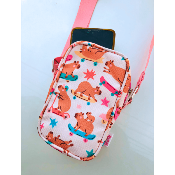 Llevá tu celular a todas partes con esta adorable bandolera de capibaras. Su diseño colorido y divertido la convierte en el accesorio perfecto para niñas que aman la ternura de estos animalitos tan simpáticos .